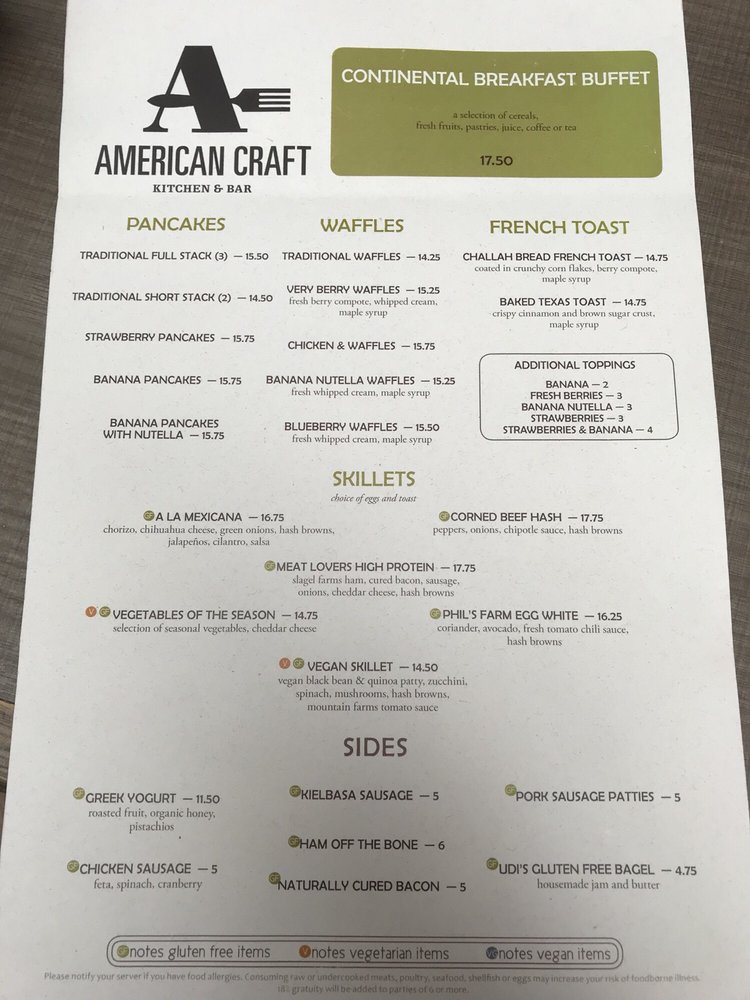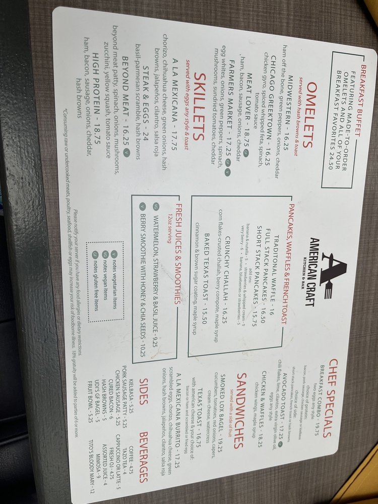 American Craft Kitchen & Bar is a popular American breakfast and brunch spot located at 151 E Wacker Dr in Chicago. Known for its solid hotel lobby restaurant ambiance, this establishment offers a variety of vegan and vegetarian options, along with a buffet and regular waiter service. Customers rave about the delicious breakfast buffet selection, including fresh salmon and bakery items. The restaurant also serves conventional lunch and dinner options, such as Chicago dogs, pulled pork sandwiches, and pimento cheeseburgers. With attentive servers and a cozy atmosphere, American Craft Kitchen & Bar provides a satisfying dining experience for guests. Whether you're looking for a hearty breakfast or a tasty lunch, this place is worth a visit for its quality food and excellent service.